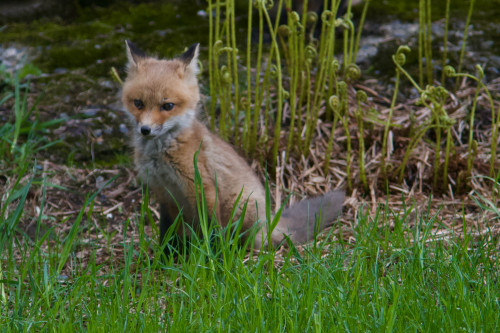 The fox kits first starting appearing about twenty years ago. At first glance, I thought they were kittens playing in the unmown grass. They have reappeared off and on in late April ever since, sometimes with their mother, at my barn or a den down the hill from my house near a row of healthy American chestnut trees I had planted. When the foxes didn’t show up for a couple of years, I sprinkled some drops of fox attractant that my son Alec had left. It didn’t take long for a fox family to arrive, but for the first time they were gray foxes, the species native to Maine (red foxes either migrated from Canada during the colonization of New England or were imported by the British for fox hunts in the 1700s). The gray foxes are omnivores and stuck around for the summer (the kits and both parents), first eating cherries that had dropped from my trees and then sunflower seed on the ground at the bird feeders. The red foxes disappear into the woods by early June, but their scat, footprints in winter and diggings for voles are sure signs that they are nearby.